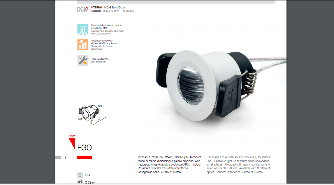 DGA EGO Bianco IP52 743002.76A 1W Lente 40° 3000°K 350mA Incasso