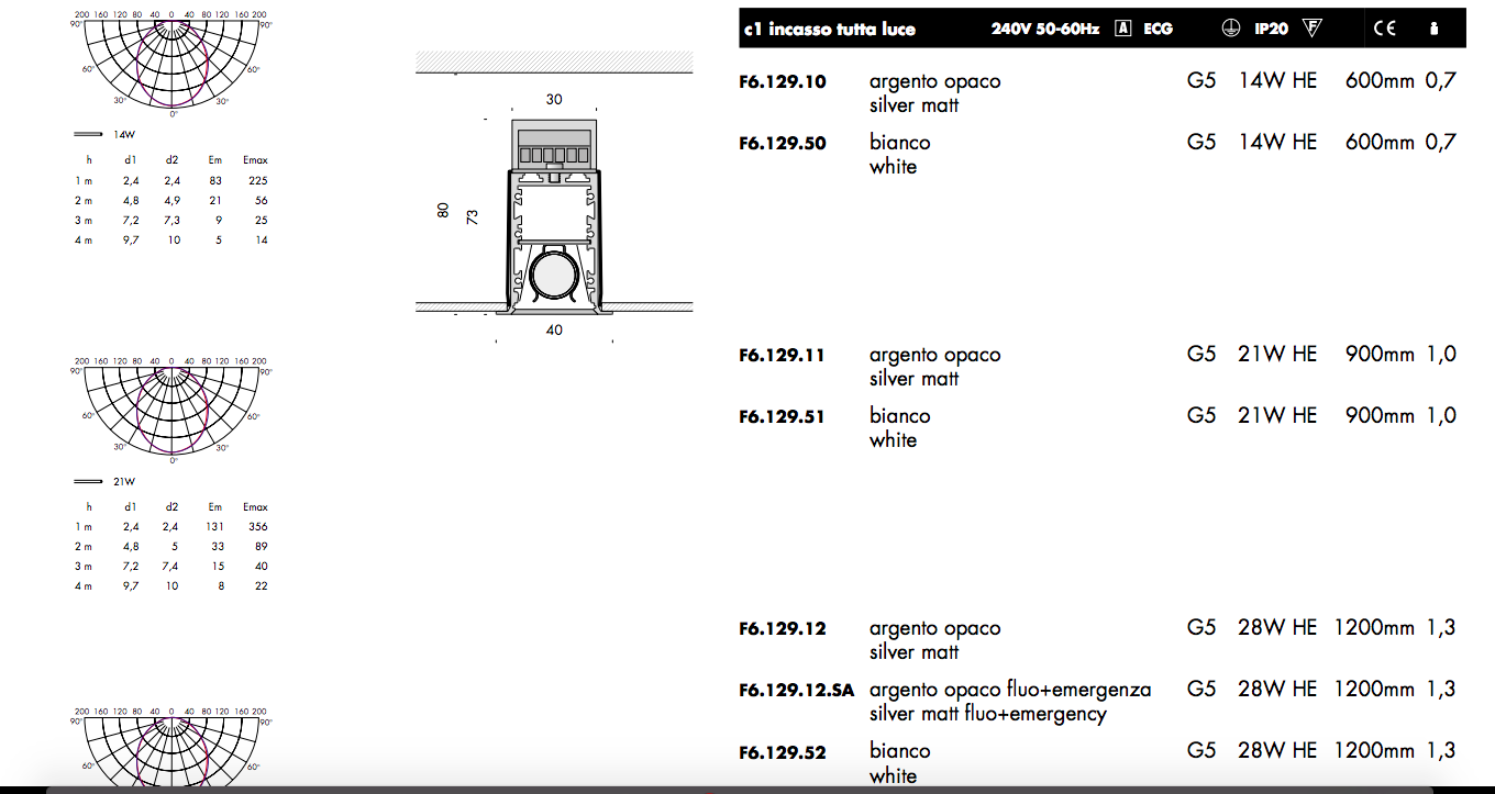 Viabizzuno C1 Incasso Tutta Luce Argento Opaco G5 14W HE 600mm F6.129.10