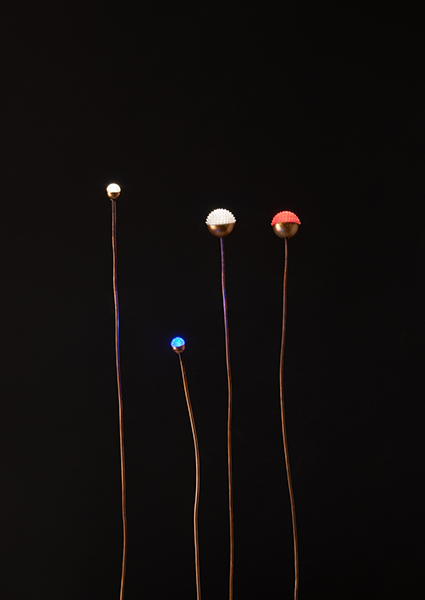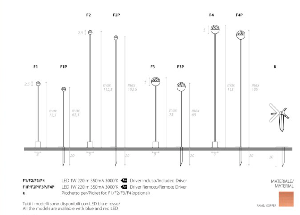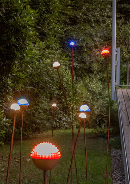 Un diffusore sferico ospita la fonte luminosa e una lente in silicone che diffonde la luce senza abbagliare. Il supporto in rame naturale, sul quale si forma nel tempo una patina che aumenta la durata, si confonde nella natura, contribuendo ad integrarne Soffio: che diventa un fiore luminoso, discreto protagonista nell’oscurità.