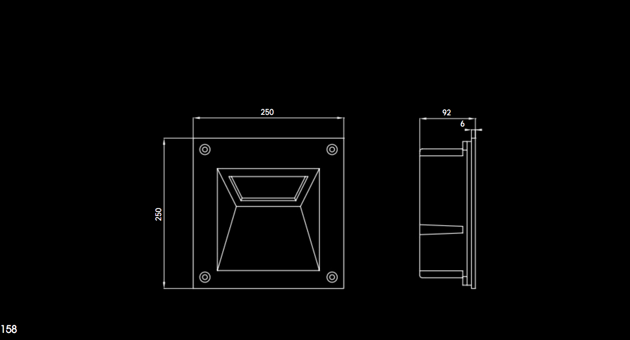 Struttura: corpo dell’apparecchio in alluminio pressofuso verniciato a polvere di poliestere previo trattamento di fosfocromatazione con cornice di chiusura in alluminio verniciato (4 colori disponibili), vetro temprato trasparente e guarnizioni in silicone stampato.