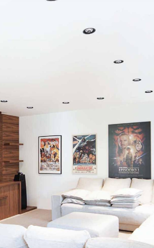 Apparecchio ad incasso con cornice per cartongesso a una,due, tre luci orientabili, dalla forma arrotondata. Disponibili nelle versioni con lampada a ioduri metallici, lampade alogene a bassissima tensione o lampade miste, in due colori: con corpo in acciaio verniciato nero e cornice colore alluminio, con corpo e cornice colore bianco. Gruppo ottico interno in alluminio pressofuso che consente un'inclinazione massima della lampada di 30° rispetto all'asse. Nella versione con lampada a ioduri mettallici l'apparecchio è fornito con riflettore in alluminio 40° e con vetro di protezione UV.