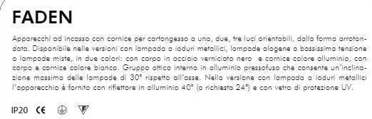 Apparecchio ad incasso con cornice per cartongesso a una,due, tre luci orientabili, dalla forma arrotondata. Disponibili nelle versioni con lampada a ioduri metallici, lampade alogene a bassissima tensione o lampade miste, in due colori: con corpo in acciaio verniciato nero e cornice colore alluminio, con corpo e cornice colore bianco. Gruppo ottico interno in alluminio pressofuso che consente un'inclinazione massima della lampada di 30° rispetto all'asse. Nella versione con lampada a ioduri mettallici l'apparecchio è fornito con riflettore in alluminio 40° e con vetro di protezione UV.