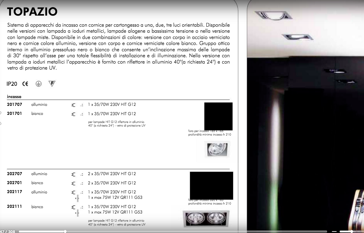Sistema di apparecchi da incasso con cornice per cartongesso a una, due, tre luci orientabili. Disponibile nelle versioni con lampada a ioduri metallici, lampada alogene a bassissima tensione o nella versione con lampada miste. Disponibile in due combinazioni di colore: versione con corpo in acciaio verniciato nero e cornice colore alluminio, versione con corpo e cornice verniciate colore bianco. Gruppo ottico interno in alluminio pressofuso nero o bianco che consente un'inclinazione massima delle lampade di 30° rispetto all'asse per una totale flessibilità di installazione e di illuminazione. Nella versione con lampada a ioduri metallici l'apparecchio è fornito con riflettore d'alluminio 40° e con vetro di protezione UV.