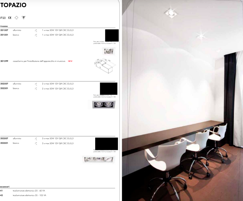 Sistema di apparecchi da incasso con cornice per cartongesso a una, due, tre luci orientabili. Disponibile nelle versioni con lampada a ioduri metallici, lampada alogene a bassissima tensione o nella versione con lampada miste. Disponibile in due combinazioni di colore: versione con corpo in acciaio verniciato nero e cornice colore alluminio, versione con corpo e cornice verniciate colore bianco. Gruppo ottico interno in alluminio pressofuso nero o bianco che consente un'inclinazione massima delle lampade di 30° rispetto all'asse per una totale flessibilità di installazione e di illuminazione. Nella versione con lampada a ioduri metallici l'apparecchio è fornito con riflettore d'alluminio 40° e con vetro di protezione UV.