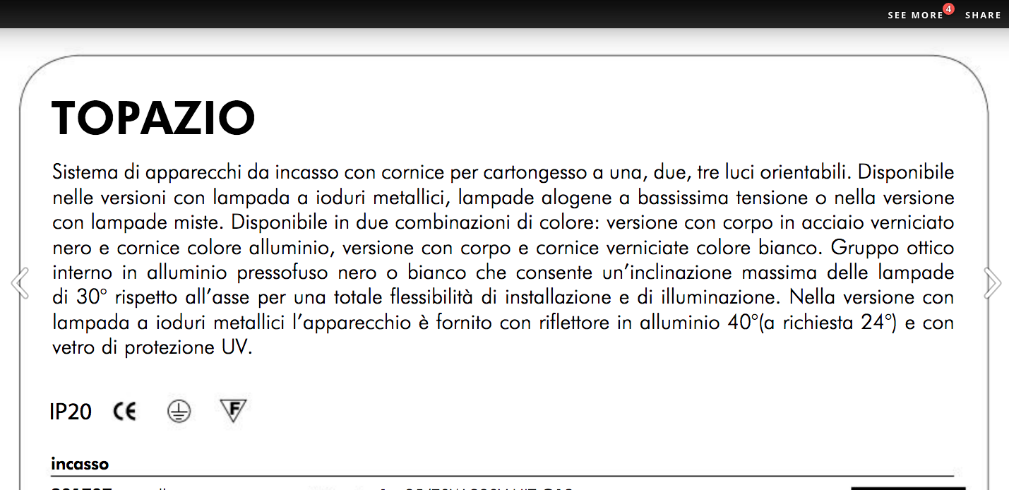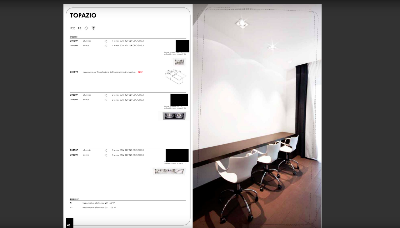 Sistema di apparecchi da incasso con cornice per cartongesso a una, due, tre luci orientabili. Disponibile nelle versioni con lampada a ioduri metallici, lampada alogene a bassissima tensione o nella versione con lampada miste. Disponibile in due combinazioni di colore: versione con corpo in acciaio verniciato nero e cornice colore alluminio, versione con corpo e cornice verniciate colore bianco. Gruppo ottico interno in alluminio pressofuso nero o bianco che consente un'inclinazione massima delle lampade di 30° rispetto all'asse per una totale flessibilità di installazione e di illuminazione. Nella versione con lampada a ioduri metallici l'apparecchio è fornito con riflettore d'alluminio 40° e con vetro di protezione UV.