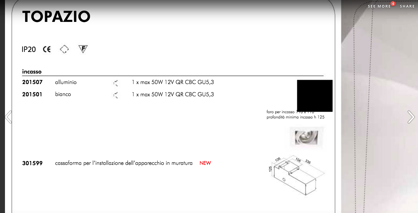 Sistema di apparecchi da incasso con cornice per cartongesso a una, due, tre luci orientabili. Disponibile nelle versioni con lampada a ioduri metallici, lampada alogene a bassissima tensione o nella versione con lampada miste. Disponibile in due combinazioni di colore: versione con corpo in acciaio verniciato nero e cornice colore alluminio, versione con corpo e cornice verniciate colore bianco. Gruppo ottico interno in alluminio pressofuso nero o bianco che consente un'inclinazione massima delle lampade di 30° rispetto all'asse per una totale flessibilità di installazione e di illuminazione. Nella versione con lampada a ioduri metallici l'apparecchio è fornito con riflettore d'alluminio 40° e con vetro di protezione UV.