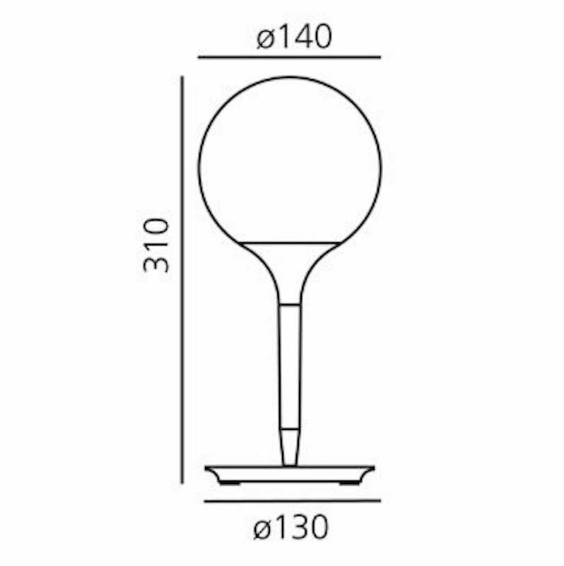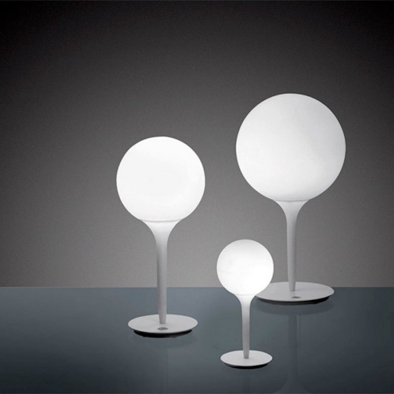 Il design del diffusore sferico viene esaltato dalla presenza di uno stelo luminoso, dalla linea morbida e affusolata, che costituisce il dolce passaggio dalla luce intensa del diffusore alla zona d’ombra della struttura della lampada. Base in zama; stelo in resina termoplastica; diffusore in vetro soffiato.