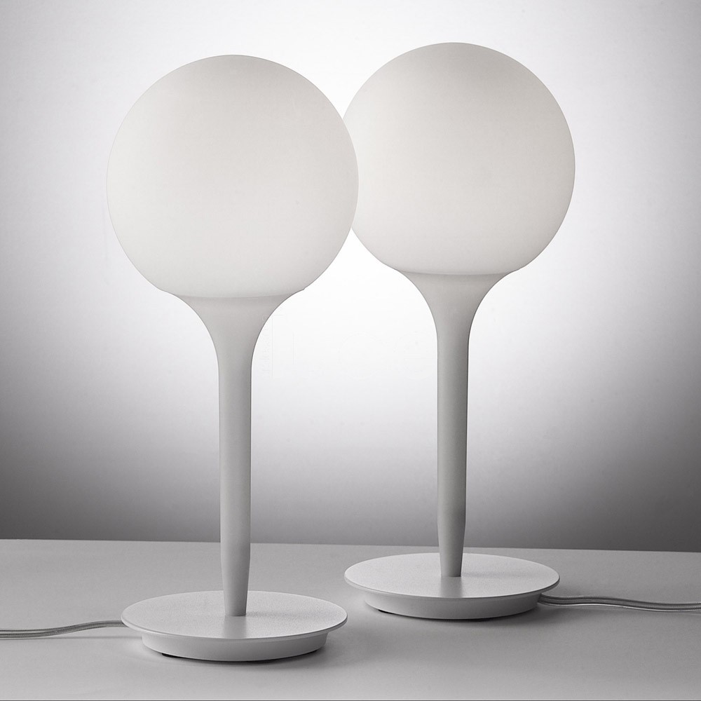 Il design del diffusore sferico viene esaltato dalla presenza di uno stelo luminoso, dalla linea morbida e affusolata, che costituisce il dolce passaggio dalla luce intensa del diffusore alla zona d’ombra della struttura della lampada. Base in zama; stelo in resina termoplastica; diffusore in vetro soffiato.