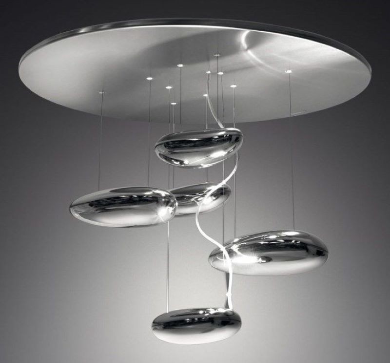 Ampliamenti di gamma della serie Mercury, di dimensioni più piccole. Corpi riflettenti in materiale termoplastico stampato ad iniezione con finitura metallizzata. Riflettore in acciaio inox. Una lampada che consiste in una serie di grandi ciotoli fluttuanti sotto un disco semplice e moderno. A loro volta, i ciotoli si riflettono l’un l’altro, facendo rimbalzare la luce tra le loro lisce superfici biomorfiche. Durante il giorno l’oggetto è una scultura che riflette le dinamiche della luce naturale e il movimento delle persone attorno a sé. Materiali: struttura in acciaio inox satinato e alluminio verniciato. Corpi illuminanti in alluminio cromato. Pendenti in plastica cromata