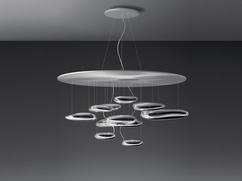 Una lampada che consiste in una serie di grandi ciotoli fluttuanti sotto un disco di alluminio semplice e moderno. A loro volta, i ciotoli si riflettono l’un l’altro, facendo rimbalzare la luce tra le loro lisce superfici biomorfiche. Durante il giorno l’oggetto è una scultura che riflette le dinamiche della luce naturale e il movimento delle persone attorno a sé. Corpi luminosi in alluminio pressofuso; corpi riflettenti in materiale termoplastico stampato ad iniezione con finitura metallizzata; riflettore in alluminio stampato. Dimmable (SwitchDim).