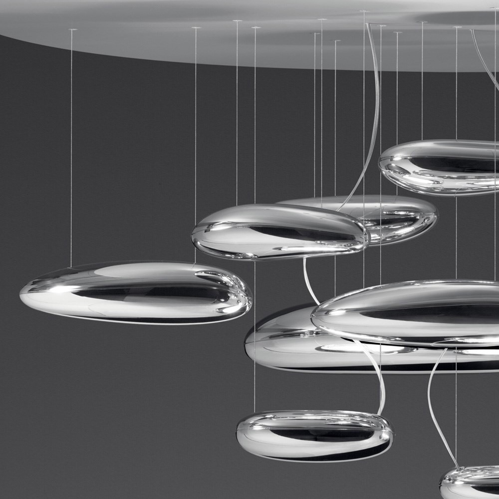 Una lampada che consiste in una serie di grandi ciotoli fluttuanti sotto un disco di alluminio semplice e moderno. A loro volta, i ciotoli si riflettono l’un l’altro, facendo rimbalzare la luce tra le loro lisce superfici biomorfiche. Durante il giorno l’oggetto è una scultura che riflette le dinamiche della luce naturale e il movimento delle persone attorno a sé. Corpi luminosi in alluminio pressofuso; corpi riflettenti in materiale termoplastico stampato ad iniezione con finitura metallizzata; riflettore in alluminio stampato. Dimmable (SwitchDim).