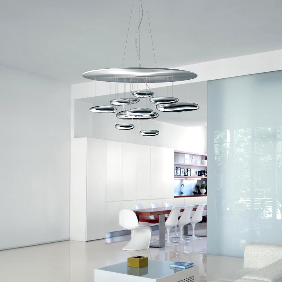Una lampada che consiste in una serie di grandi ciotoli fluttuanti sotto un disco di alluminio semplice e moderno. A loro volta, i ciotoli si riflettono l’un l’altro, facendo rimbalzare la luce tra le loro lisce superfici biomorfiche. Durante il giorno l’oggetto è una scultura che riflette le dinamiche della luce naturale e il movimento delle persone attorno a sé. Corpi luminosi in alluminio pressofuso; corpi riflettenti in materiale termoplastico stampato ad iniezione con finitura metallizzata; riflettore in alluminio stampato. Dimmable (SwitchDim).