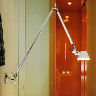 Struttura a bracci mobili in alluminio lucidato; diffusore in alluminio anodizzato opaco o alluminio brillantato; snodi e supporto parete in alluminio brillantato. Sistema di equilibratura a molle.