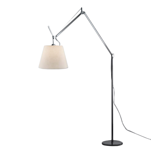 Struttura a bracci mobili in alluminio anodizzato lucido o nero, snodi e supporti in alluminio brillantato. Diffusore orientabile sull’asse orizzontale in carta pergamena o in raso o in tessuto nero supportato da materiale plastico, disponibile in tre dimensioni. Sistema di equilibratura a molle. Emissione di luce: diretta e diffusa orientabile.