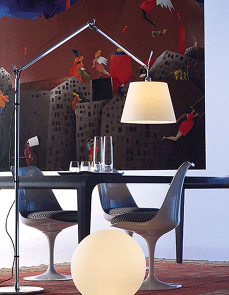 Struttura a bracci mobili in alluminio lucidato; diffusore in carta pergamena o in raso di seta supportato da materiale plastico; supporto parete in alluminio brillantato. Sistema di equilibratura a molle.