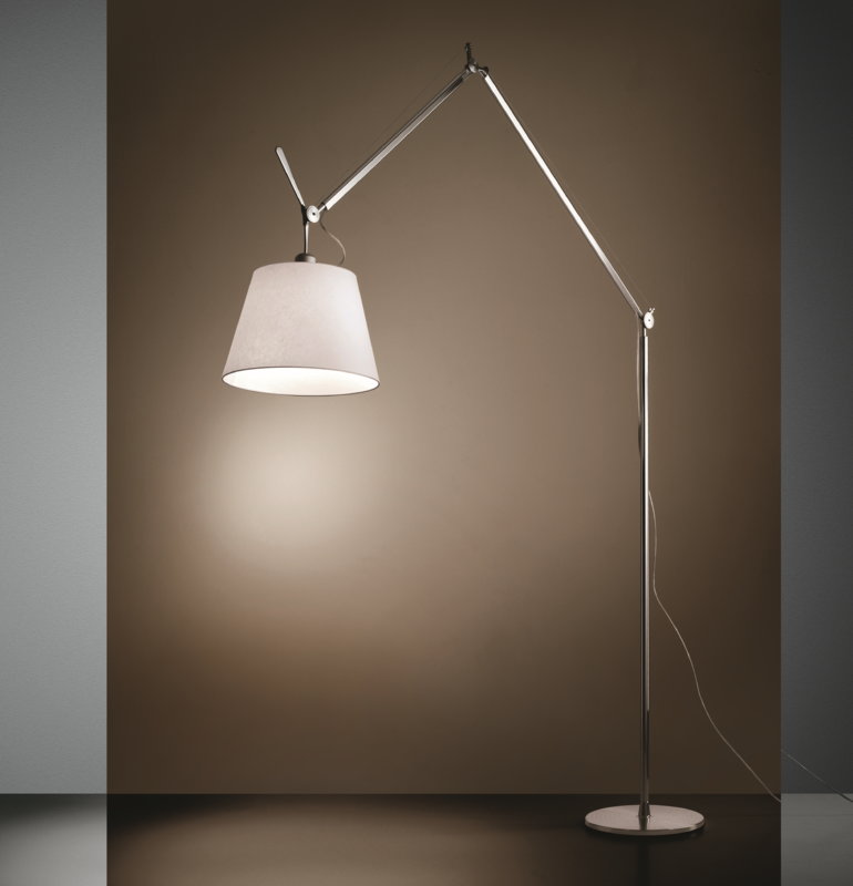 Struttura a bracci mobili in alluminio lucidato; diffusore in carta pergamena o in raso di seta supportato da materiale plastico; supporto parete in alluminio brillantato. Sistema di equilibratura a molle.