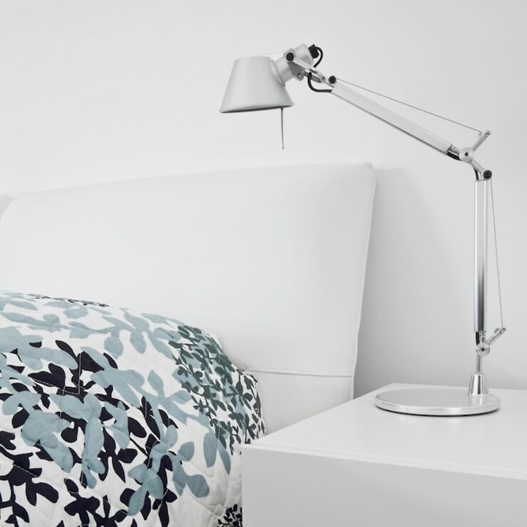 Base e struttura a bracci mobili in alluminio lucidato; diffusore in alluminio anodizzato opaco; snodi e supporti in alluminio brillantato. Sistema di equilibratura a molle. Codice riferito solo al corpo lampada