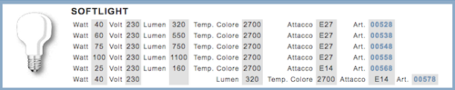 Caratteristiche illuminotecniche e fotometriche Flusso 160 lm Temperatura di colore nominale CCT 2700 K Indice resa cromatica 100 Durata di vita 1000 h Tempo di innesco <0,2 s Tempo di riscaldamento fino al 60% del rendimento completo Piena Luce Istantanea Caratteristiche elettriche Potenza nominale 25 W Tensione d’ingresso 230 Vac Frequenza 50 Hz Dimmerabile Si Corrente d’ingresso 0,1 A Numero cicli 6000 Temperatura di esercizio -15°C / +35°C Posizione di funzionamento 360°