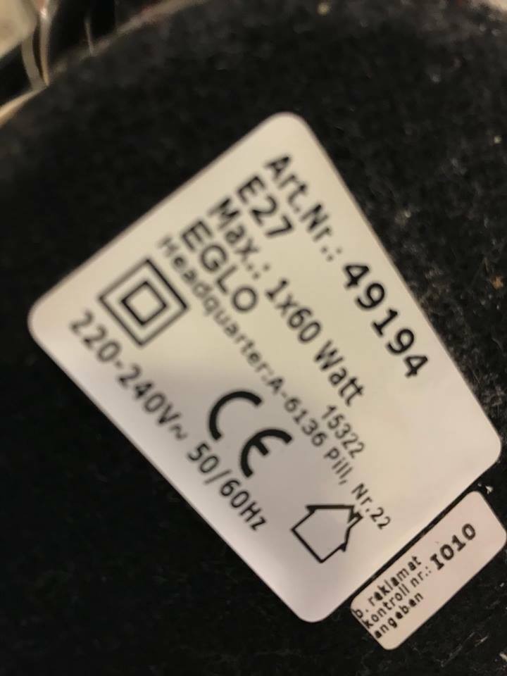 Produttore Eglo Materiale metallo Colore nero Tipo di attacco E27 Numero di lampadine 1 Massima potenza elettrica 60 W Funzione Interruttore sul cavo Altezza 410 mm Diametro 105 mm Peso 0,36 kg Grado di protezione (IP) IP20 Tensione di alimentazione 230 V Classe di isolamento 1