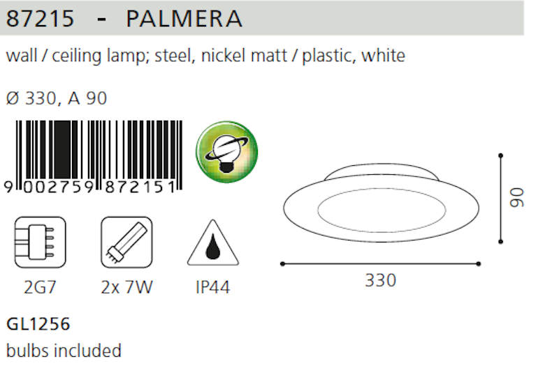Produttore: Eglo Materiale metallo ; plastica Colore Nichel Matt Attacco: 2G7 Numero di lampadine 2 Potenza della sorgente 7 W. Consumo energetico totale dell'illuminazione 14 W. Diametro 330 mm Grado di protezione (IP) IP44 Tensione 230 volt Classe di protezione contro le scosse elettriche 1