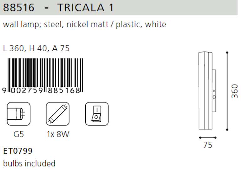 Funzione Lampada con interruttore incorporato Luogo Cucina Massima potenza elettrica 8 W Materiale metallo; plastica Potenza elettrica 8 W Stile Classico Tensione di alimentazione 230 V Tipo di attacco G5 Tipo Illuminazione sottopensile Produttore Eglo Colore bianco Altezza 4 cm Lunghezza 7,5 cm Grado di protezione (IP) IP20 Lunghezza 36cm Numero di lampadine 1