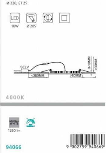 Bianco neutro Tonalità della luce 4000 K Potenza elettrica 18 W Equivalente alla lampadina classica 125 W Massima potenza elettrica 18 W Flusso luminoso (luminosità) totale 2000 lm Massima potenza assorbita della lampada 18 W Funzione Tecnologia LED Durata di vita media della sorgente 25000 ore Diametro 225 mm Foro montatura 210 mm Foro profondità 25 mm Peso 0,53 kg Grado di protezione (IP) IP20 Numero di pezzi nella confezione 1 Tensione di alimentazione 230 V Classe di isolamento 2 Classe di efficienza energetica A+
