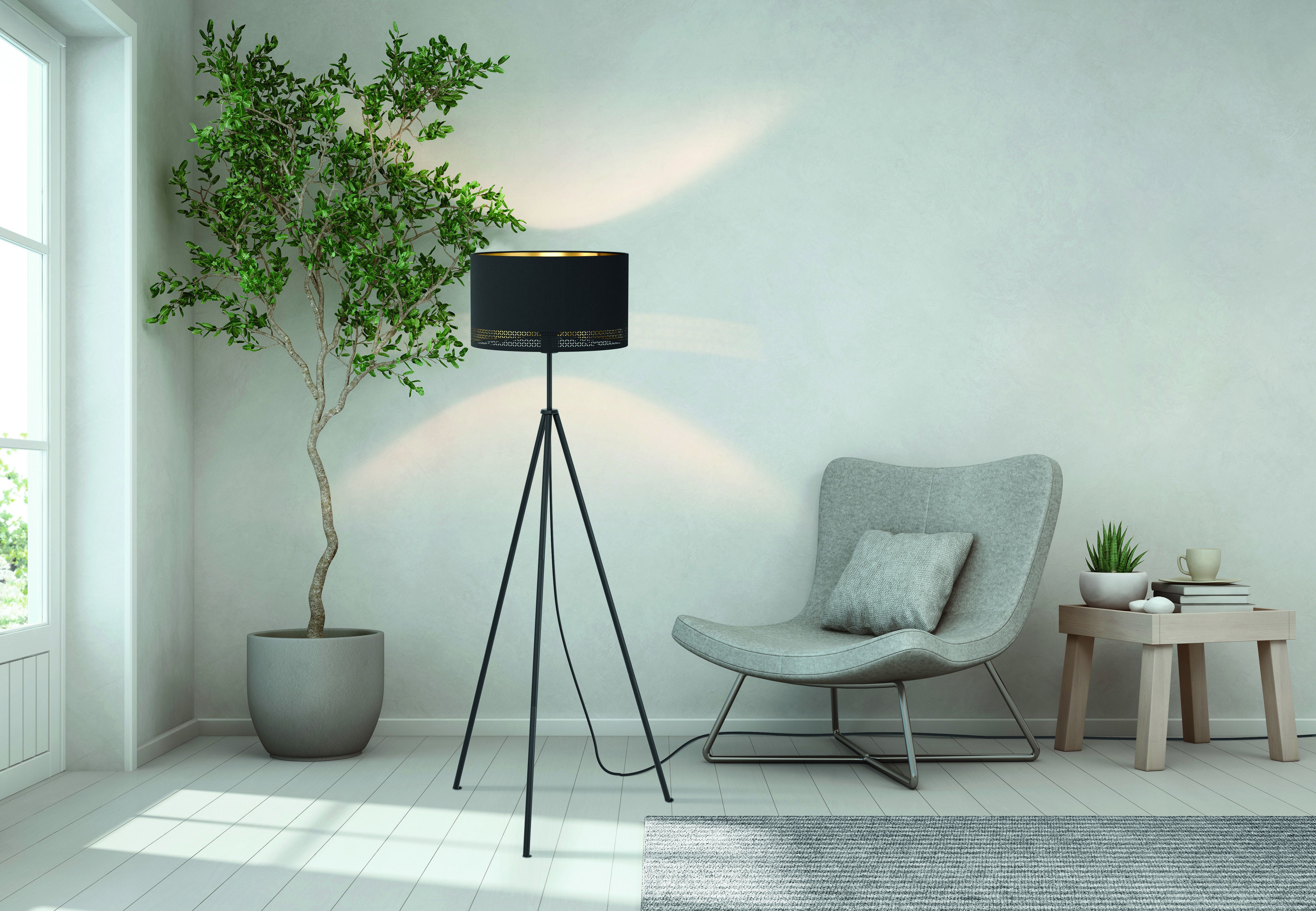 La piantana ESTEPERRA è composta da una base in metallo nero e da un paralume nero di stoffa e interno dorato. Sul bordo del paralume sono riportati dei piccoli ritagli che creano un intrigante gioco di luci e ombre quando la lampada è accesa. Inoltre, è possibile accendere e spegnere la lampada comodamente tramite un interruttore a pedale presente sul cavo. Questa lampada si armonizza perfettamente in qualsiasi stile di arredamento offrendo un’elegante illuminazione in ogni ambiente, che sia nella camera da letto, nel soggiorno o nella sala da pranzo. La lampadina non è inclusa nella consegna. Per la lampada è adatta qualsiasi lampadina con attacco E27.