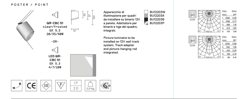 Point Poster: Apparecchio di illuminazione per quadri da installare su binario 12V a parete. Adattatore per binario e tige del quadro, integrati.