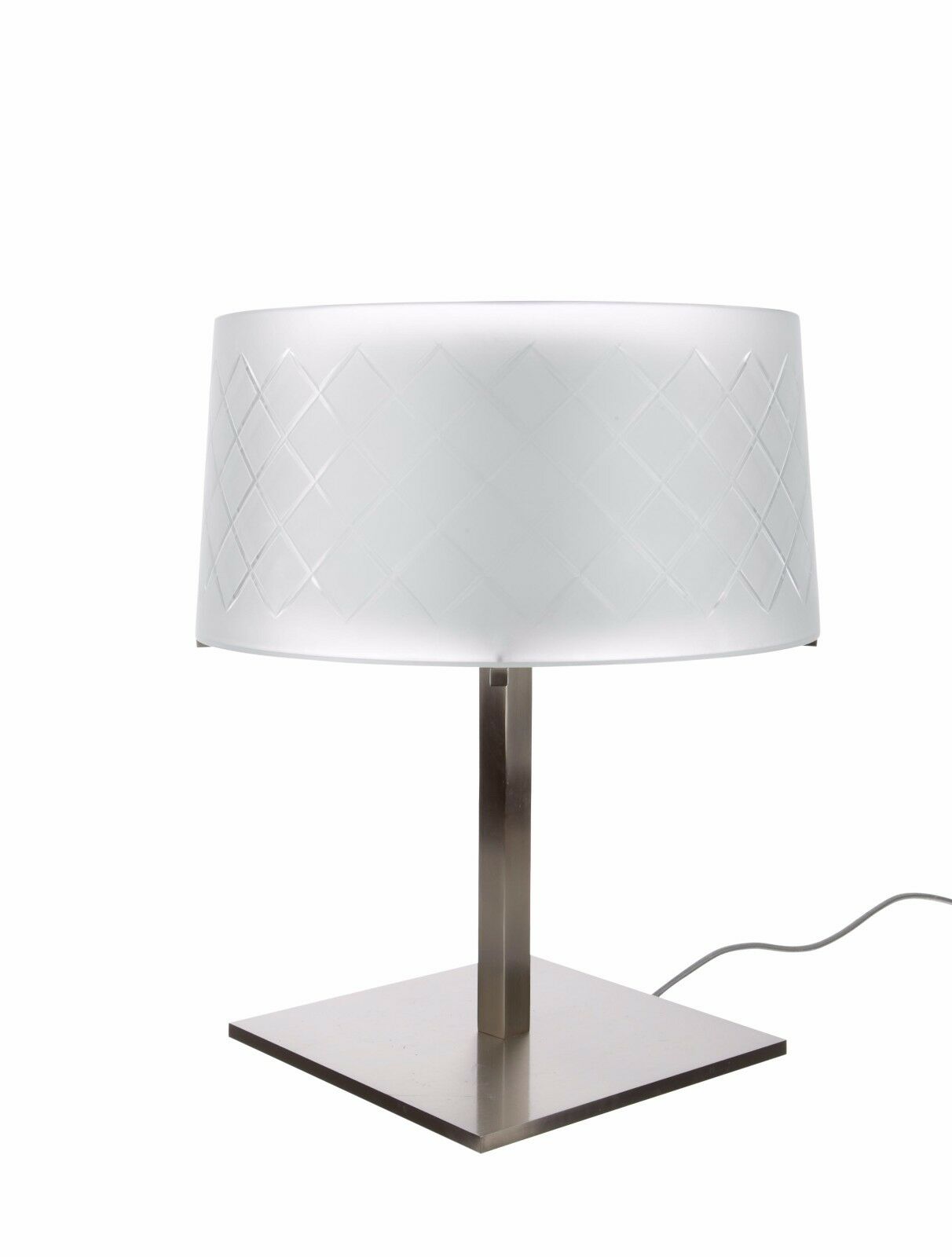 Lampada da tavolo a luce diffusa. Struttura in ottone con finitura nichel satinato. Diffusore interno in vetro opale soffiato a bocca, diffusore esterno in vetro trasparente acidato e molato a mano. Regolazione luminosa mediante dimmer su cavo.