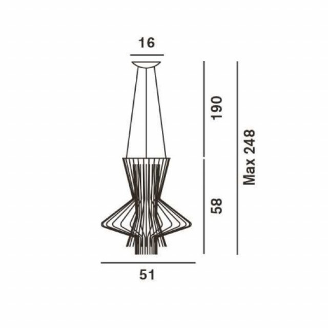 Materiali: struttura in metallo cromato e aste in tondino di alluminio verniciato; tre cavi di sospensione in acciaio inossidabile; rosone con staffa in metallo zincato e copertura in ABS cromato lucido.