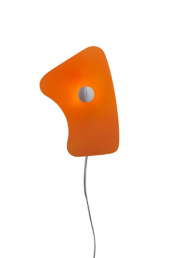 Lampada da parete realizzata con diffusore in vetro serigrafato satinato, montato su un supporto di metallo laccato, disponibile in diverse forme e colori.
