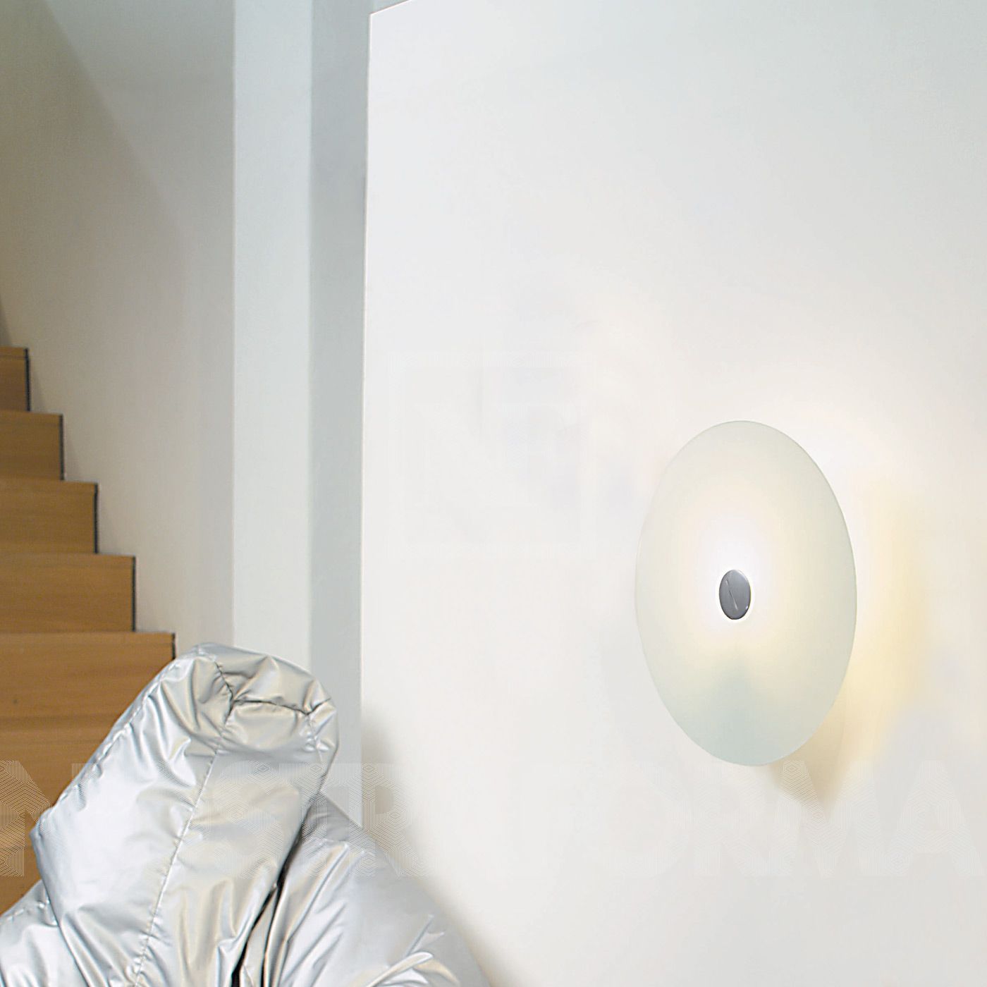 Lampada da parete realizzata con diffusore in vetro serigrafato satinato, montato su un supporto di metallo laccato, disponibile in diverse forme e colori.