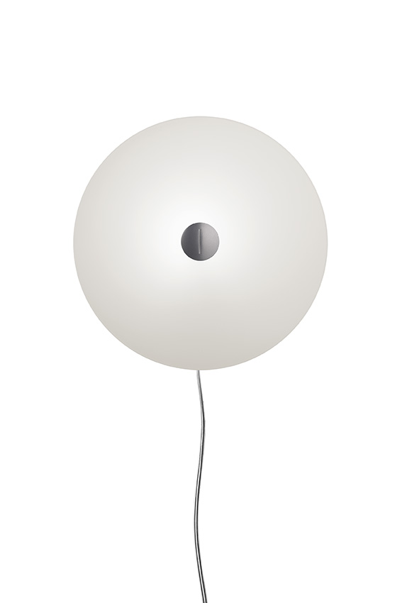Lampada da parete realizzata con diffusore in vetro serigrafato satinato, montato su un supporto di metallo laccato, disponibile in diverse forme e colori.