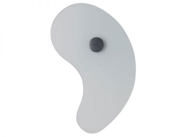 Lampada da parete realizzata con diffusore in vetro serigrafato satinato, montato su un supporto di metallo laccato, disponibile in diverse forme e colori.
