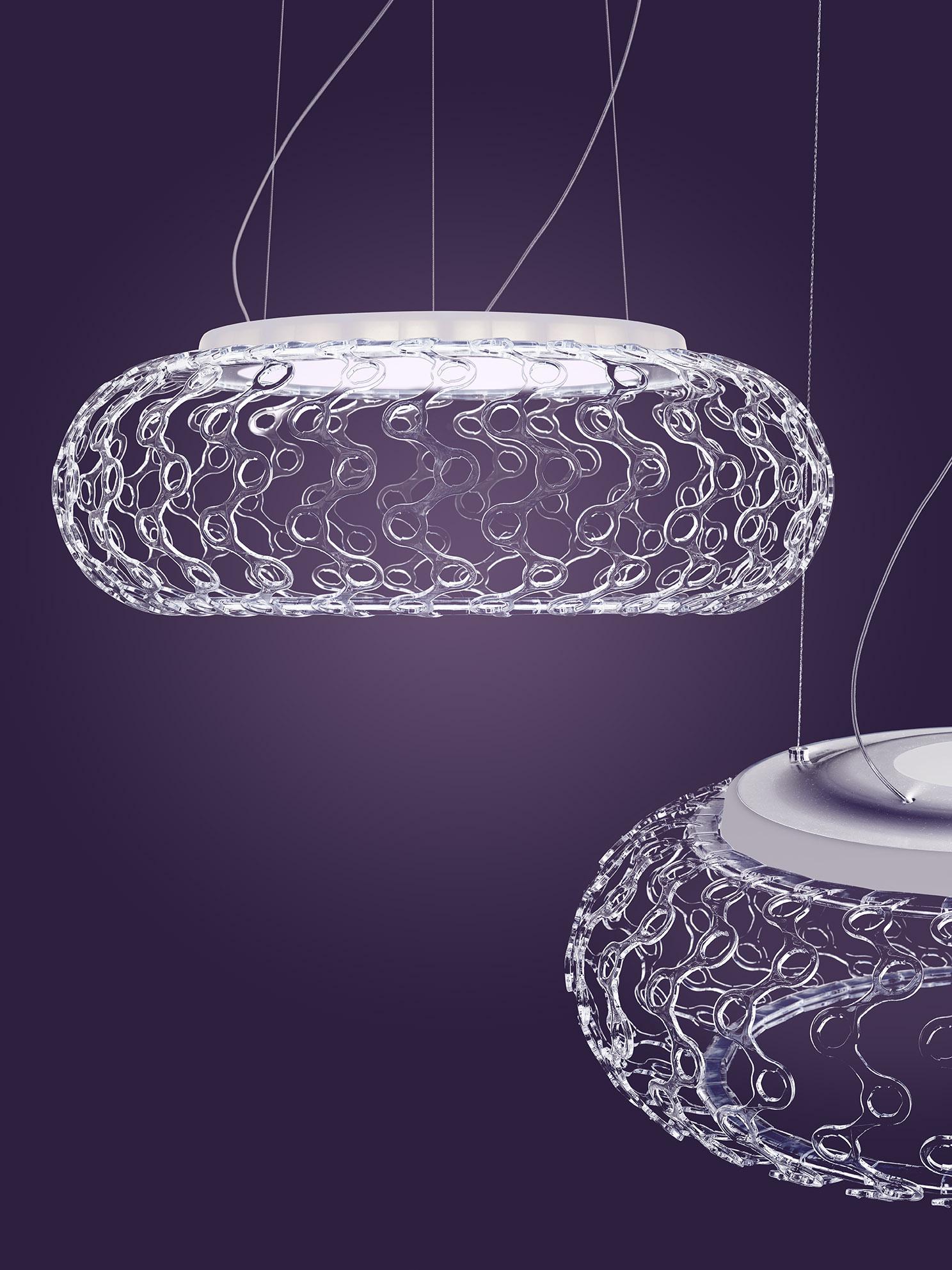 L'effetto cristallo, che dona al progetto leggerezza e trasparenza, è il risultato dell'insieme di sfere in polimetilmetacrilato fissate ad archetti e diffusori in vetro trasparente. Il risultato è un perfetto gioco di rifrazioni che sprigiona la luce a 360°, diretta sul piano e riflessa al soffitto.