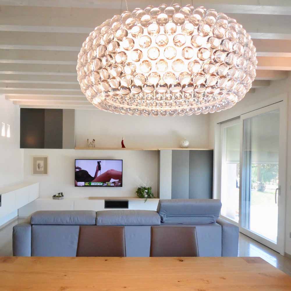 L'effetto cristallo, che dona al progetto leggerezza e trasparenza, è il risultato dell'insieme di sfere in polimetilmetacrilato fissate ad archetti e diffusori in vetro trasparente. Il risultato è un perfetto gioco di rifrazioni che sprigiona la luce a 360°, diretta sul piano e riflessa al soffitto.