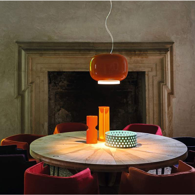 Caratteristiche tecniche: Dimensioni Ø 40 cm - H. 31 cm Sorgente luminosa: LED inclusi 24W COB 2700°K - 2581lm - CRI>90. Versione dimmerabile Configurazioni possibili: On-Off/Push/DALI. Materiali: vetro soffiato verniciato. Finiture: arancione.