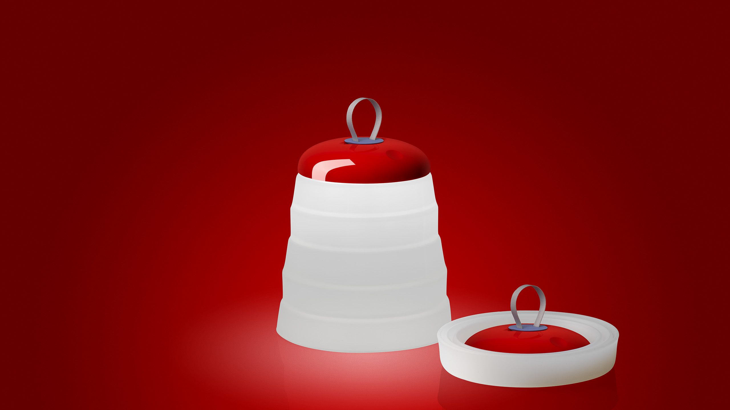 Dimensioni: Ø 23,5 cm - H. 30,8 cm Sorgente luminosa: LED 2,4W. Dimmerabile. Batteria ricaricabile interna. Materiali: silicone, ABS e PMMA Finiture: rosso.