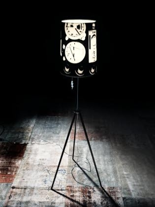 In tessuto e metallo cromato, è disponibile nelle versioni a sospensione, da terra o da tavolo. Il fascio luminoso è caldo e discreto e crea un effetto soffuso. Accensione a tiretta.