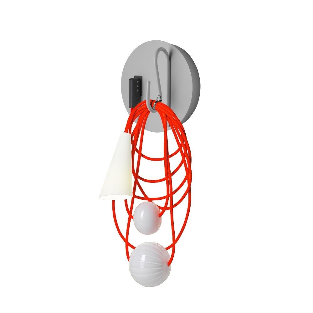 Filo Pareteè una lampada disponibile in diverse combinazioni di colore dei suoi elementi: base in metallo verniciato, corpo in cavo tessile, accessori e paralume in vetro soffiato e porcellana.