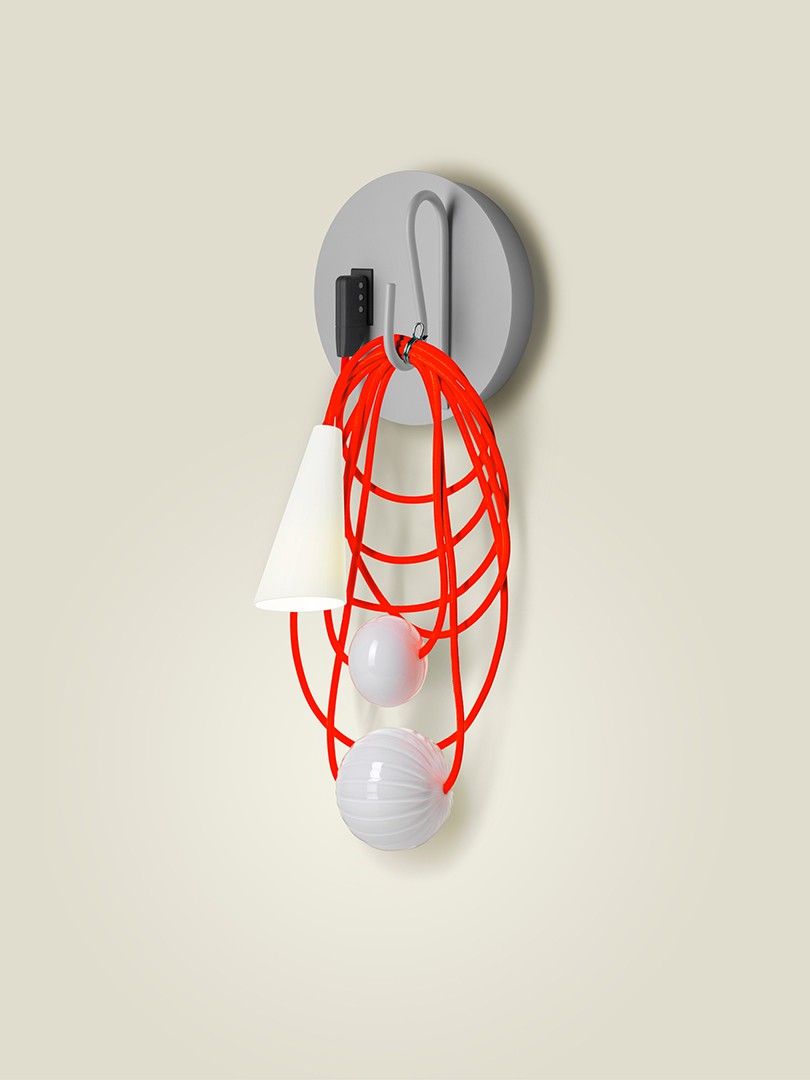 Materiali: porcellana, vetro soffiato, cavo tessile e metallo verniciato.