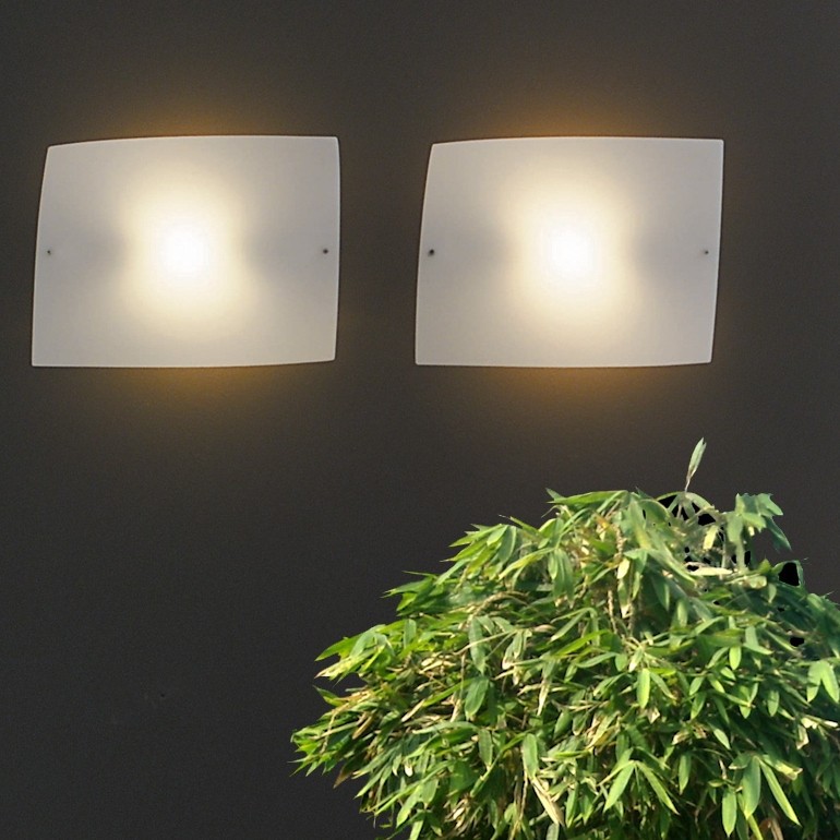 Lampada da parete con supporto in metallo laccato e diffusore in vetro soffiato e satinato; bianco all'interno, colorato all'esterno o in vetro serigrafato.