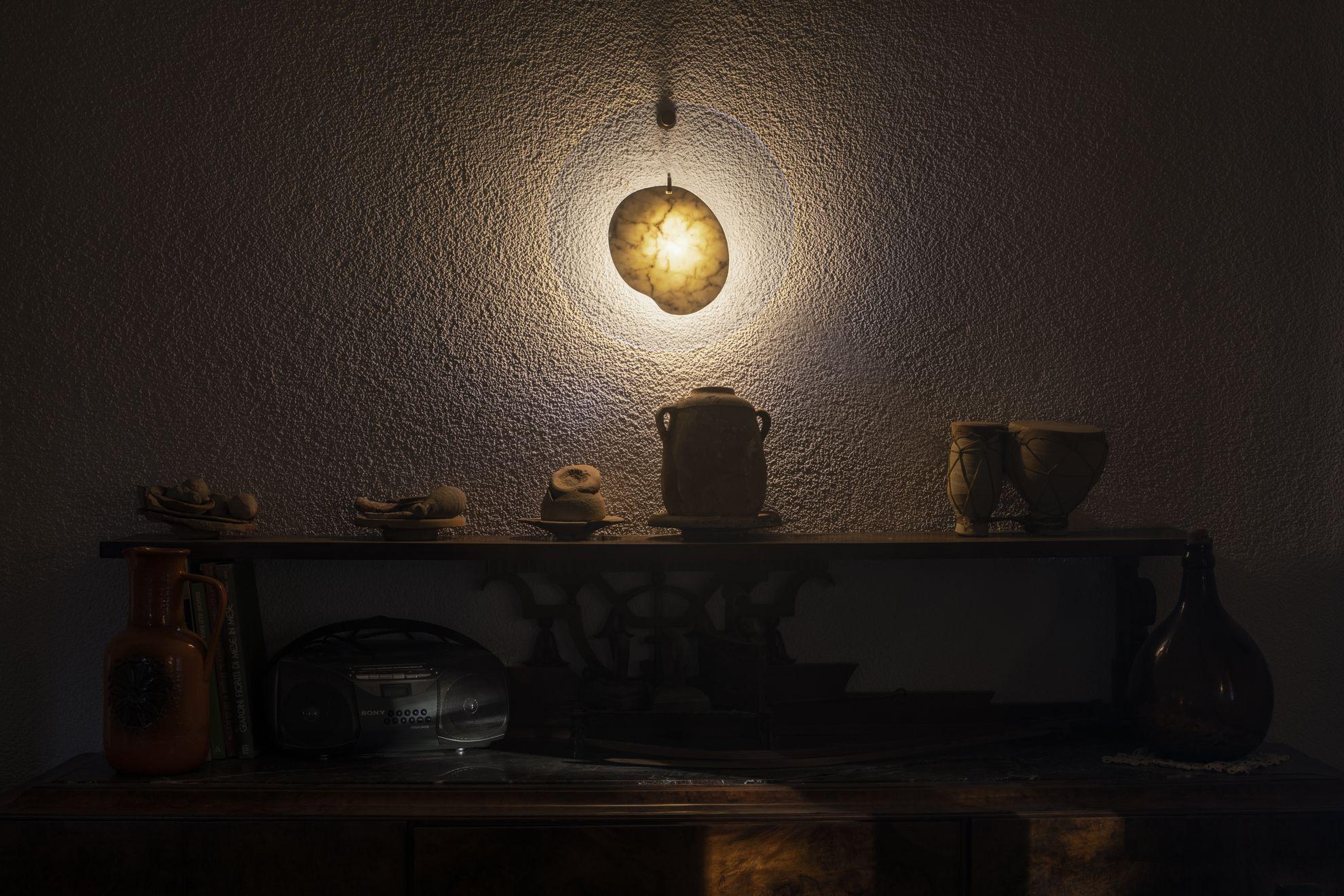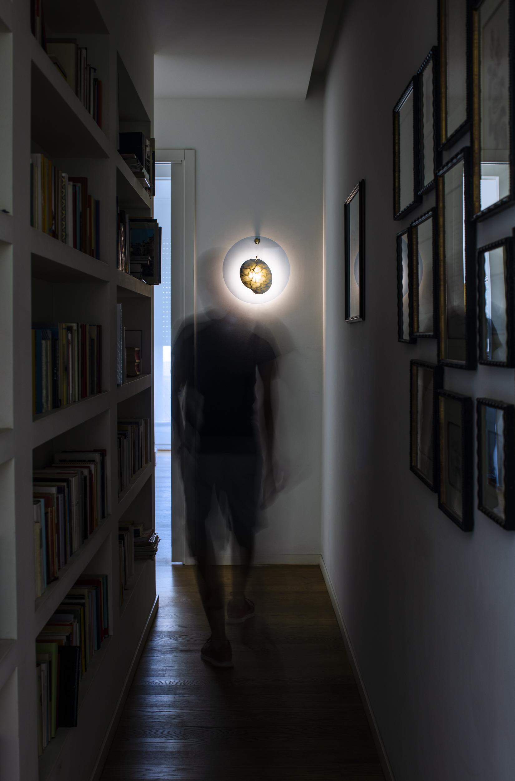 La magia della lampada sta nella composizione: un elemento in marmo statuario collocato al centro di un disco in Perspex trasparente. A unire i due materiali, un unico anello impreziosito da una lavorazione artigianale; l’insieme è a sua volta fissato alla parete da un piccolo perno. I due elementi, liberi di muoversi, ricordano il ritmo oscillante di un pendente o di un orecchino. La trasparenza del PMMA contrasta con l’opacità del marmo: è l’incontro tra un passato che richiama la statuaria, i fregi e le grandi opere architettoniche e un presente fatto di invenzioni e di materiali sintetici. In Gioia la parte funzionale della lampada è slegata da quella decorativa. La luce proviene dalla fonte luminosa LED a parete, che lascia all’elemento decorativo piena libertà di movimento.