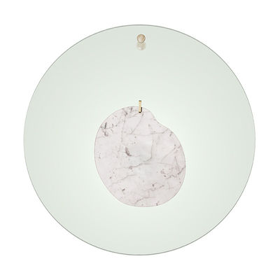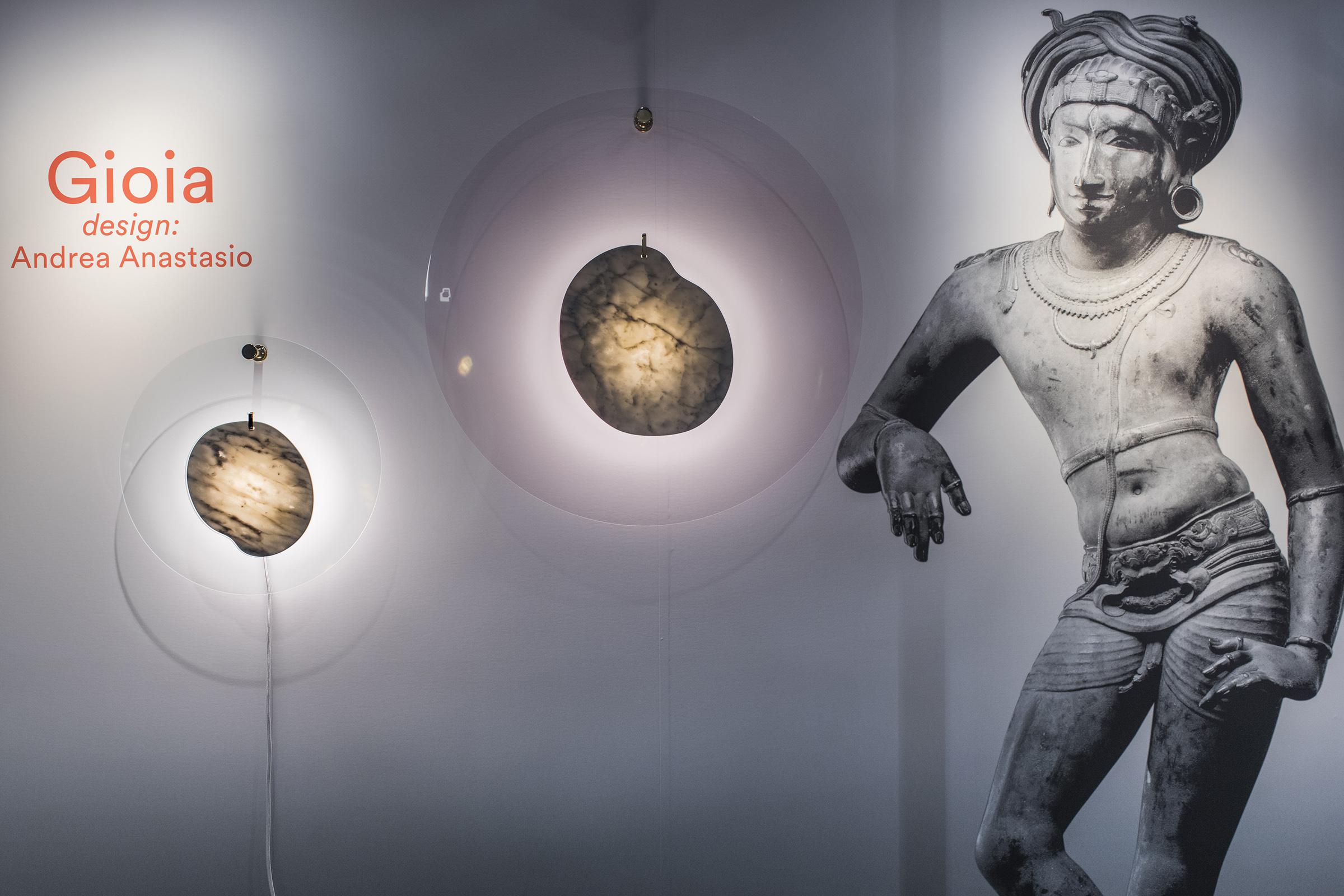 La magia della lampada sta nella composizione: un elemento in marmo statuario collocato al centro di un disco in Perspex trasparente. A unire i due materiali, un unico anello impreziosito da una lavorazione artigianale; l’insieme è a sua volta fissato alla parete da un piccolo perno. I due elementi, liberi di muoversi, ricordano il ritmo oscillante di un pendente o di un orecchino. La trasparenza del PMMA contrasta con l’opacità del marmo: è l’incontro tra un passato che richiama la statuaria, i fregi e le grandi opere architettoniche e un presente fatto di invenzioni e di materiali sintetici. In Gioia la parte funzionale della lampada è slegata da quella decorativa. La luce proviene dalla fonte luminosa LED a parete, che lascia all’elemento decorativo piena libertà di movimento.