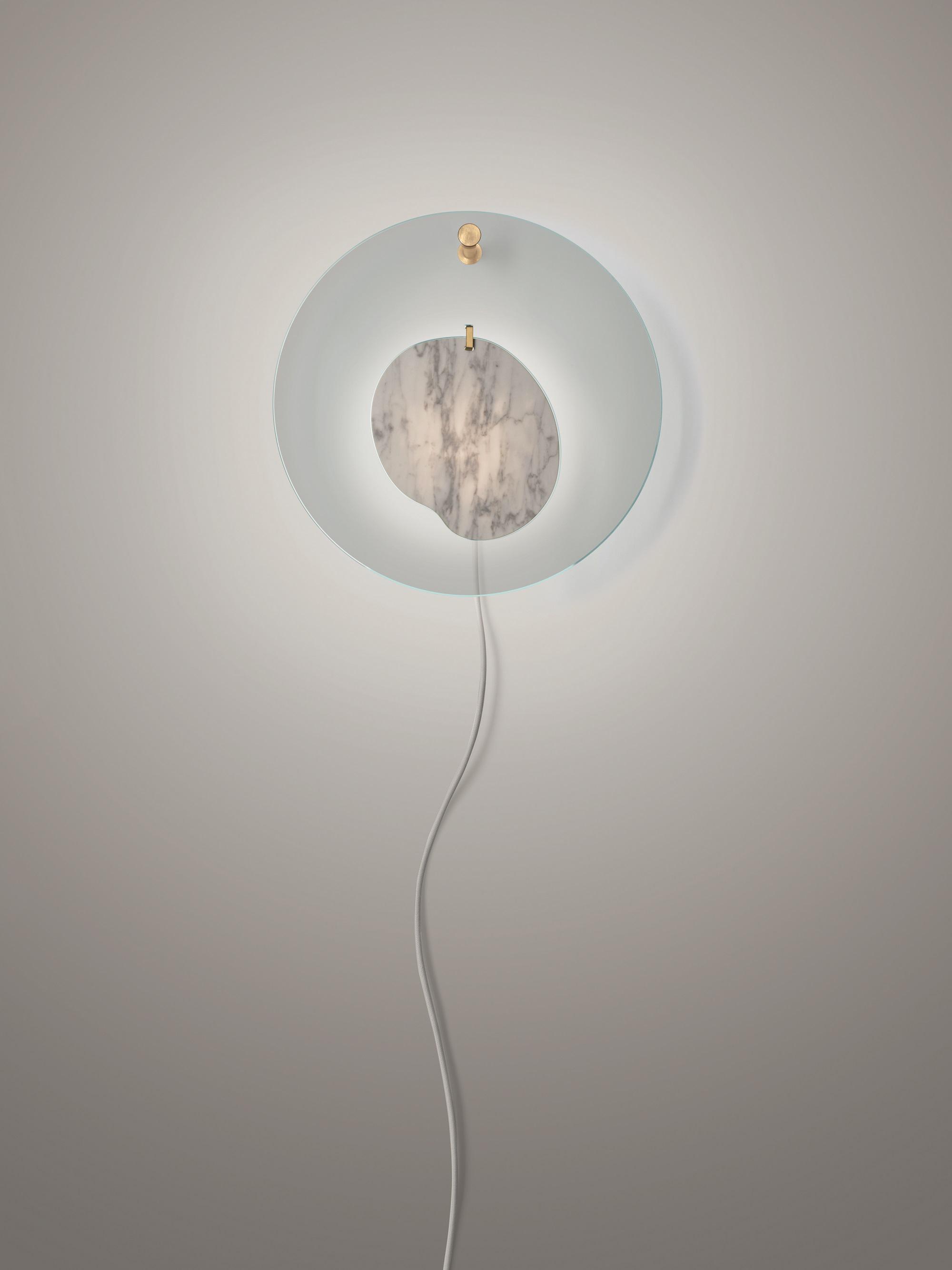 La magia della lampada sta nella composizione: un elemento in marmo statuario collocato al centro di un disco in Perspex trasparente. A unire i due materiali, un unico anello impreziosito da una lavorazione artigianale; l’insieme è a sua volta fissato alla parete da un piccolo perno. I due elementi, liberi di muoversi, ricordano il ritmo oscillante di un pendente o di un orecchino. La trasparenza del PMMA contrasta con l’opacità del marmo: è l’incontro tra un passato che richiama la statuaria, i fregi e le grandi opere architettoniche e un presente fatto di invenzioni e di materiali sintetici. In Gioia la parte funzionale della lampada è slegata da quella decorativa. La luce proviene dalla fonte luminosa LED a parete, che lascia all’elemento decorativo piena libertà di movimento.