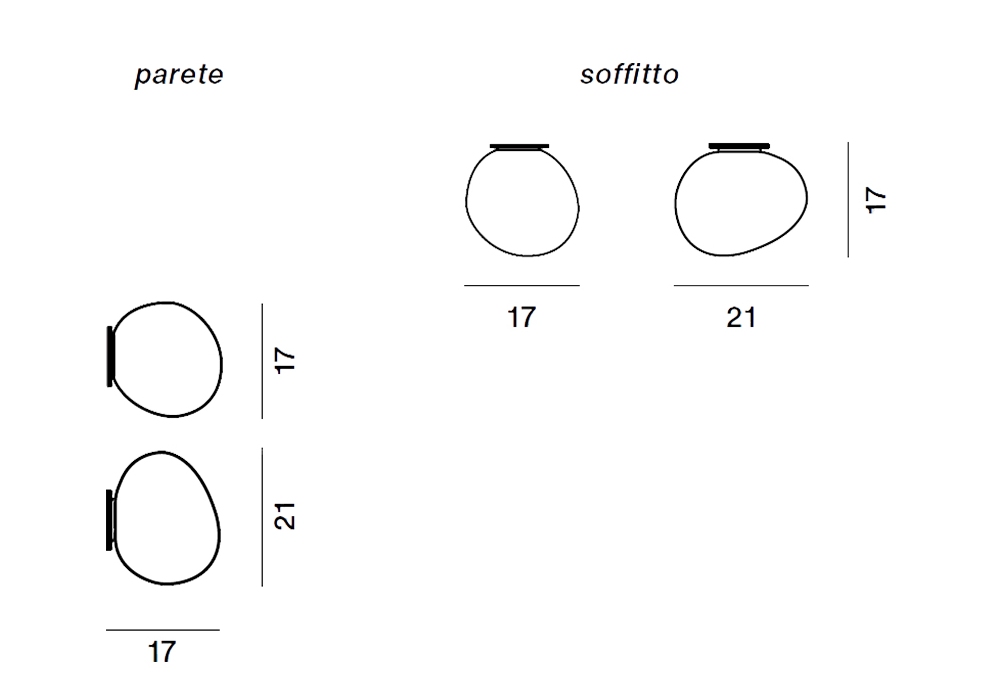 Caratteristiche tecniche Dimensioni L. 21 cm - P. 17 cm - H. 27 cm Sorgente luminosa: LED inclusi COB 8,5W 2700° K 700 lm CRI>90. Dimmerabile. Materiali: vetro soffiato acidato e metallo verniciato. Finitura: diffusore bianco satinato; portalampada bianco; ghiera trasparente; rosone bianco opaco.