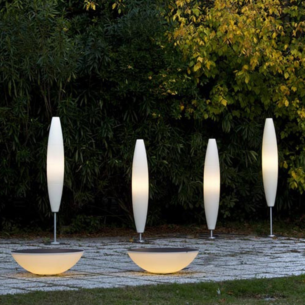 Havana Terra Outdoor di Foscarini una lampada da terra formata da quattro sezioni unite da ganci che lasciano spazio a tre sottili fasce vuote che si riempiono di luce quando la lampada è accesa. Facilmente adattabile a svariati contesti e stili.
