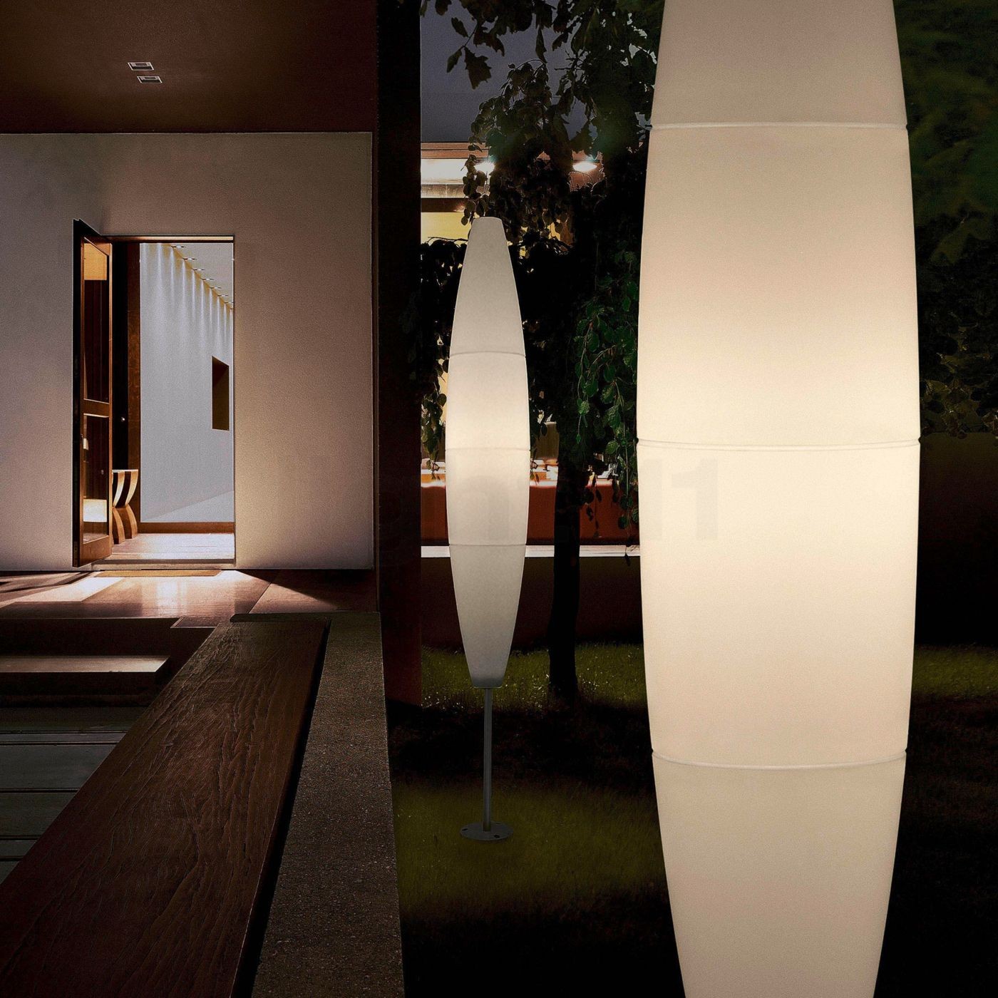 Havana Terra Outdoor di Foscarini una lampada da terra formata da quattro sezioni unite da ganci che lasciano spazio a tre sottili fasce vuote che si riempiono di luce quando la lampada è accesa. Facilmente adattabile a svariati contesti e stili.