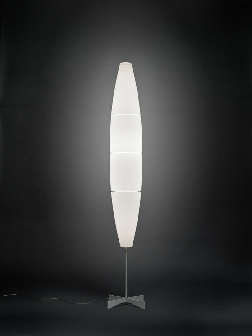 Caratteristiche tecniche Dimensioni: L. 23 cm - P. 23 cm - H. 172 cm Sorgente luminosa: 1 × 25W E27 LED retrofit o Fluo oppure 1 × 116W E27 Halo. Materiali: diffusore composto da quattro elementi in polietilene stampato uniti da gancetti in metallo; base, supporto diffusore e stelo in metallo verniciato o cromato lucido. Finiture: diffusore bianco; base in alluminio