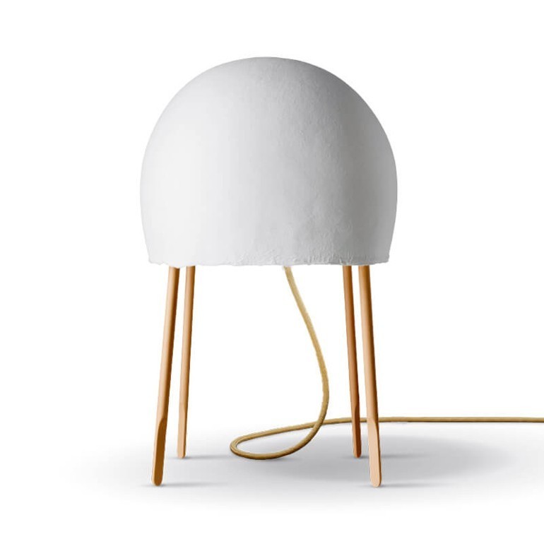 Capace di sedurre l'intelletto e il cuore, Kurage (come suggerisce il nome stesso) ricorda una medusa danzante e leggera. Al centro dell'intero design è il diffusore in carta che filtra la luce senza ombre, regalando un'atmosfera calda e rilassata. A ospitare la fonte luminosa ci pensa un portalampada in ceramica bianca. A definire tutto le sottili gambe in frassino e il cavo ricoperto con calza in fibra di carta.